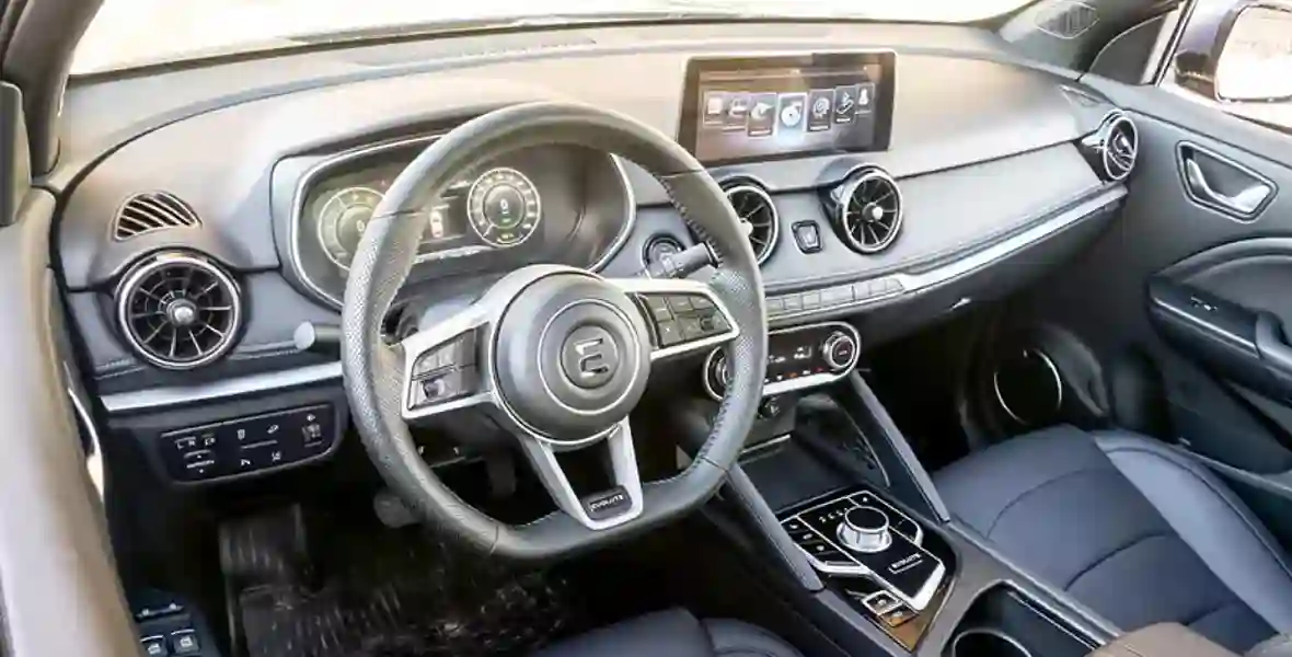 Есть полезная функция поиска зарядной станции. Что интересно: EVOLUTE создает сеть собственных электроАЗС, некоторые из которых уже работают. Например, около офиса компании в столице через порты европейский стандарт и китайский стандарт (китайский стандарт, применяющийся, в частности, на гибридах Voyah) можно получить до 150 кВт за час. Быстрые зарядки других операторов в Москве выдают максимум 50–60 кВт.